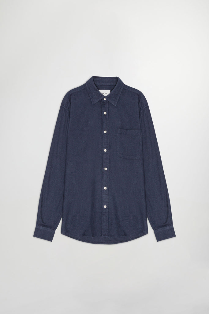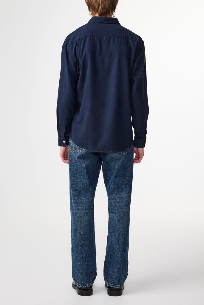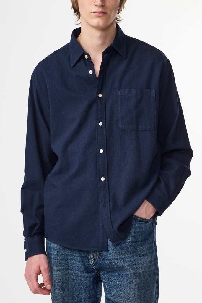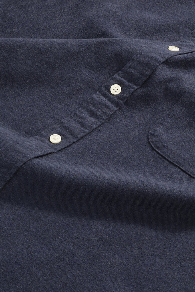Button-up shirt made in soft cotton and woven in a flannel twill weave. Designed with a single patch pocket and rounded hemline.